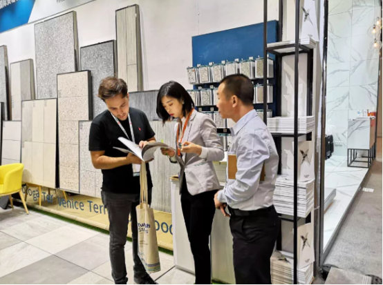 來(lái)自全球各地的客商,紛紛來(lái)到天欣科技×佛諾倫莎的展館參觀與洽談貿(mào)易合作,對(duì)于天欣科技在仿古磚的質(zhì)感和花色上,以及對(duì)于代表目前國(guó)內(nèi)高水平的2cm厚磚,客戶(hù)給予了充分的肯定,我們也再一次向世界展現(xiàn)了“CHINA”的力量。